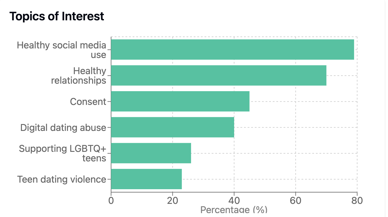 It’s no surprise that technology and social media top the list of parental concerns. An overwhelming percentage of parents expressed interest in resources focused on healthy social media use, making it the most requested topic across all age groups.